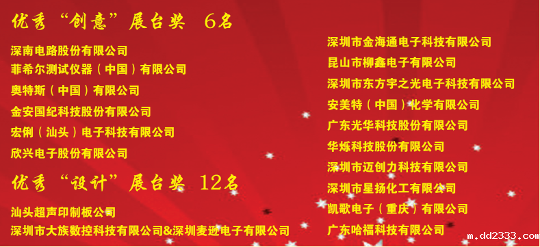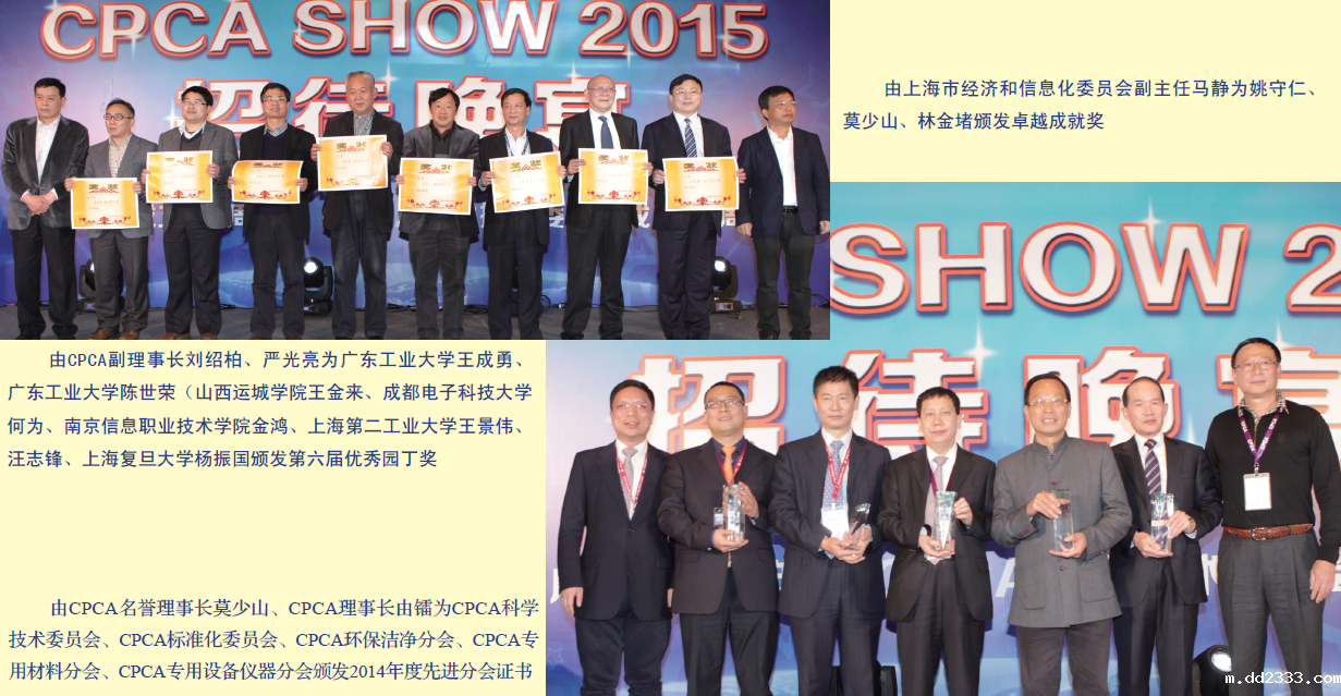 由CPCA标委会会长杨之诚、科技委副会长王成勇为珠海方正印刷电路板发展有限公司何彭;东莞生益电子有限公司杨海云;天津普林电路股份有限公司黄镇;景旺电子股份有限公司柯勇;深圳崇达多层线路板有限公司刘东;弘信电子科技股份有限公司唐杰;深南电路有限公司孟应许;广州兴森快捷电路科技有限公司吴辉;汕头超声印制板公司林伟娜、张剑如;博敏电子股份有限公司陈世金;广州兴森快捷电路科技有限公司艾鑫;东莞市五株电子科技有限公司孟昭光;广东生益科技股份有限公司叶锦荣;景旺电子科技(龙川)有限公司柯勇;深圳崇达多层线路板有限公司李清春颁奖。