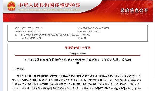 为贯彻《中华人民共和国环境保护法》《中华人民共和国水污染防治法》和《中华人民共和国大气污染防治法》,保护环境,保障人体健康,国家环保部决定制定国家环境保护标准《电子工业污染物排放标准》。目前,标准编制单位已编制完成标准的征求意见稿。根据有关规定,现就本标准征求意见稿征求各单位的意见,于2015年11月5日前通过电子邮件的方式将意见反馈至中国印制电路行业协会标准化工作委员会秘书处。标准征求意见稿及其编制说明请至: