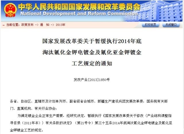 发改委关于暂缓执行2014年底淘汰氰化金钾电镀金及氰化亚金钾镀金工艺规定的通知