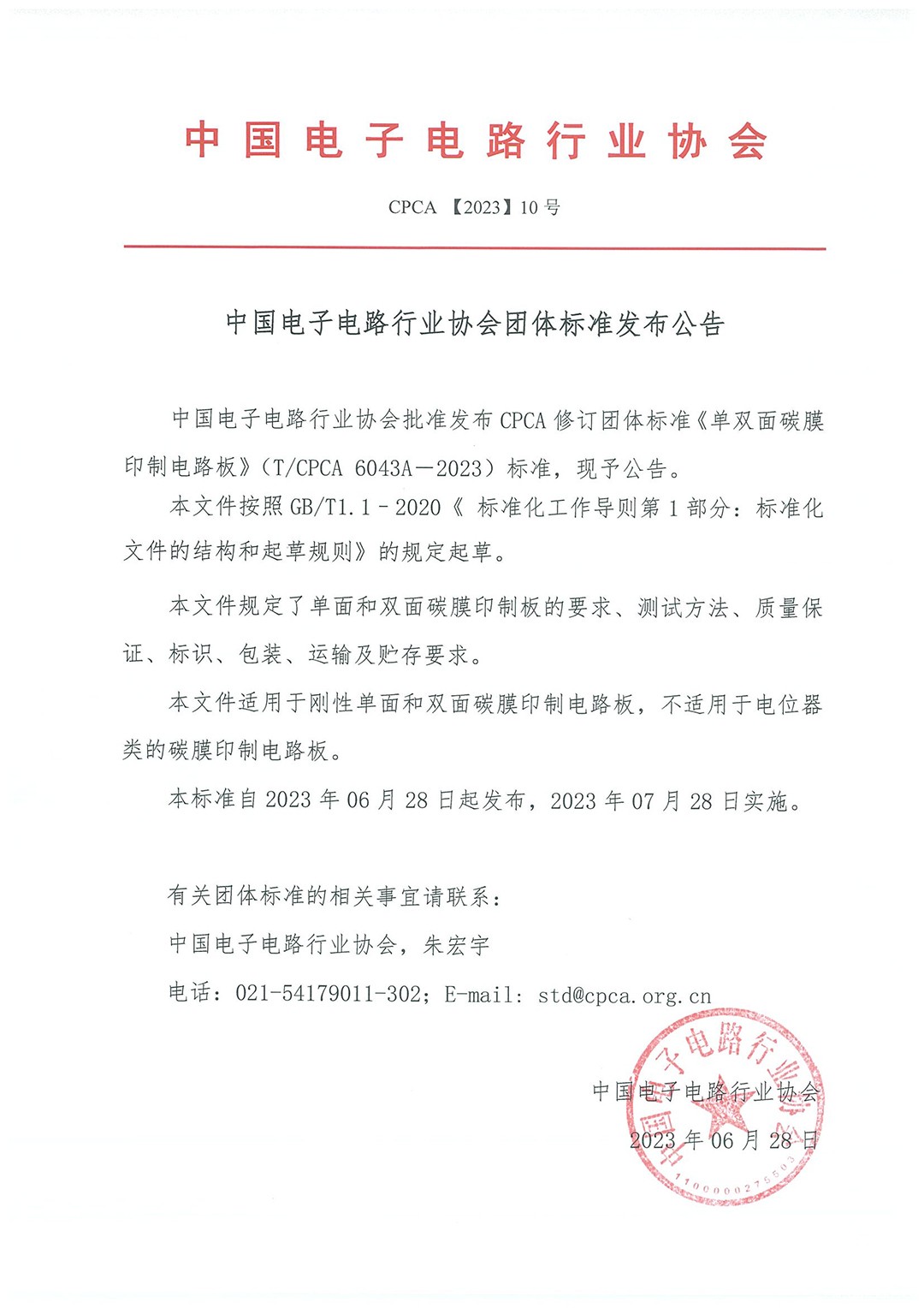 T/CPCA 6043A-2023《单双面碳膜印制电路板》发布公告